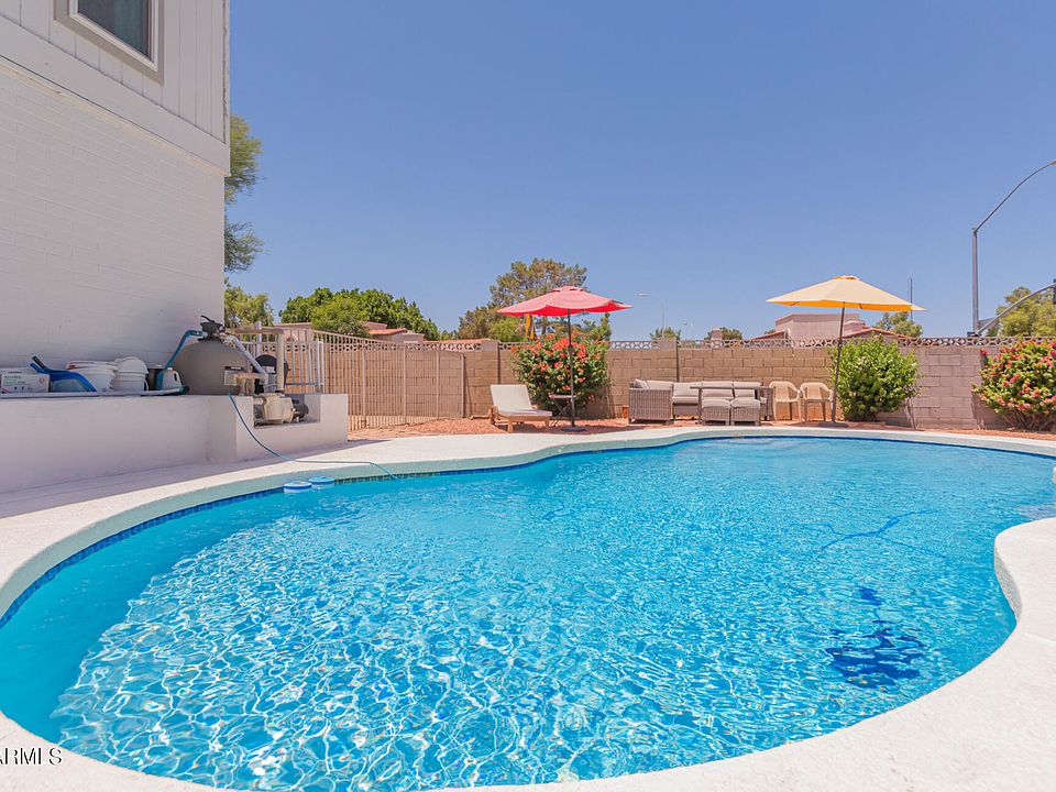 New roof (2022), New Energy windows (2022), New Sliding doors & screens (2022). Newer A/C, New water heater, New water softener system & RO system under kitchen sink. HVAC pipes sealed & Attic insulation & garage insulation (2022). Brand new LG kitchen appliances ( 2022), New granite countertops in kitchen, New flooring throughout, Remodeled master walk-in shower, Freshly painted exterior & interior. Updated sparkling pool & access to a community pool for recreation. New pool pump motor. Welcome to your dream home situated on an oversized cul-de-sac lot w/convenient access to shopping & freeways! Central location in Mesa: Close to Mesa Community College, entertainment & shopping. Don't miss the chance to make it yours!