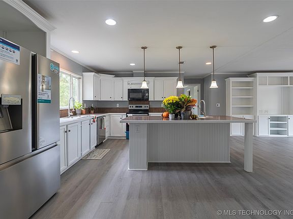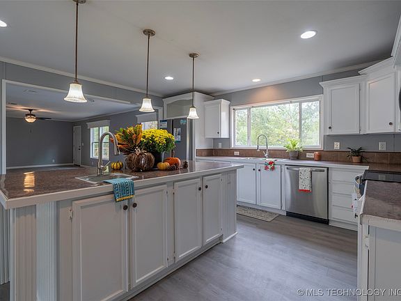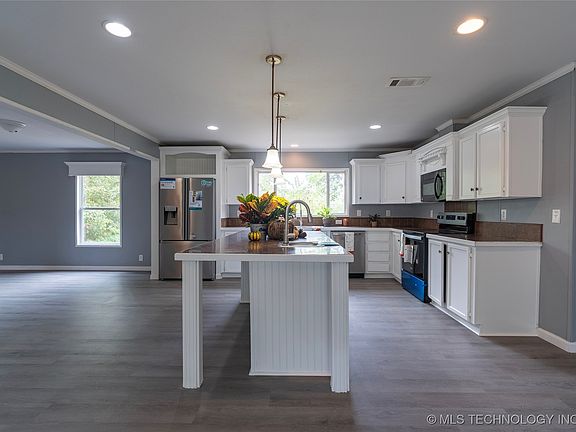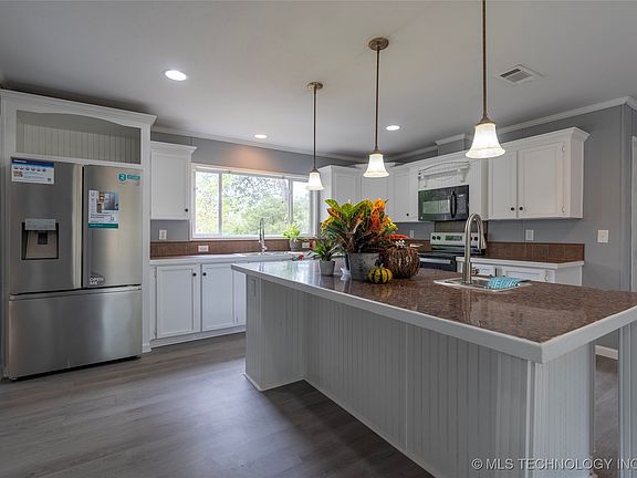 Renovated and move in ready! Entertain family and friends this holiday season in the open concept dining and living areas, as there is so much space in this 2,430+ sq ft 4 bedroom, 2 bath home sitting on just under 2 acres in a quiet country setting. Only 5 minutes to Blue Creek Park on Oologah Lake, this is a perfect spot for your boat, (there's a concrete pad for parking, or a great foundation for a shop!), RV, have some pets, and call home. The house itself features a brand new 2024 heat pump, two large living areas, one with a stone, wood-burning fireplace, and one with large wooden built-ins. A substantial open kitchen with numerous cabinets is equipped with brand new, 2024, stainless steel appliances. The split bedroom plan leaves plenty of privacy for the oversized master bedroom with it's own bathroom and walk-in closet to match. Lots of windows let in natural light throughout. If you're looking for a move in ready home within 15 minutes of downtown Claremore, 15 minutes to Chelsea, 5 minutes to the lake, and right in the country - this is your place. VA, FHA, USDA welcome.