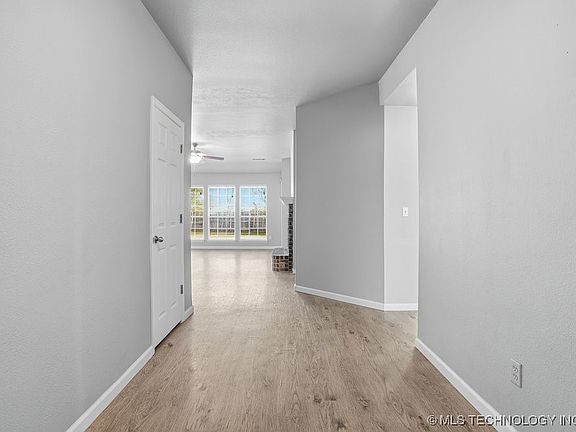A Preston Lakes Addition, single story Gem of a HOME with full-brick cladding all the way from the ground level up to the fascia board! You are welcomed by an impressive entry hall that opens to a spacious living area with a sunny presence created by a wall of windows overlooking the back lawn! Buy this home for the holidays and hang your stockings--this brick hearth fireplace has new gas logs and a beautifully updated kitchen offering abundant quartz countertops for your party buffet! Additional kitchen features include a gas range, microwave, updated & stylish tile backsplash, a window above the sink, bar seating, dining space, and a pantry! Charming nooks frame the cozy fireplace, ideal for creating custom shelving or built-ins! The primary suite has ample space for a king-size bed, cove ceiling treatment & private bathroom with double vanities, jetted tub, updated separate shower & spacious closet. The split bedroom floor plan offers nice spacing of the bedrooms, and the second and third bedrooms include double door closet space as well! Beautiful luxury vinyl flooring & tile flow throughout the home. The private backyard includes privacy fencing and a spacious patio for dining al fresco! The semi-cul-de-sac lot creates a wide back yard space and buffering between neighbors! The property is also located almost in the middle of the one square mile providing distance from busy major streets. The neighborhood offers a park, clubhouse, trails and a pool that is about a block from the property! Rogers County Tax base. This property is a must see!
