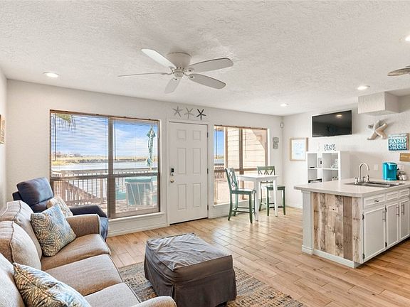 Waterfront condo with stunning sunrise views in the morning and breathtaking sunsets in the evenings, all from the comfort of your private balcony and condo space—your own coastal oasis! This income-producing 1-bedroom, 1-bath unit offers 600 sq. ft. of charm and convenience, fully furnished and turn-key. Inside, you’ll find a bright open layout with a galley kitchen and breakfast bar, dining nook, and a cozy living area with flat-screen TV. Step outside to enjoy Gulf breezes and relax as you take in the water views. Community amenities include a sparkling pool, waterfront dock and boat slips (first-come/first-served), a fishing clean-up station, private washer/dryer, Wi-Fi, and central A/C. Ideally situated just steps from Brewster’s, a short 5-minute walk to Whitecap Beach, and minutes from Mustang Island State Park and Packery Channel for fishing, kayaking, and birding. Nearby dining includes Padre Island Burger Co., Rock & Rolls Sushi, and Dragonfly. Please note: this condo is located in a noise-sensitive area and participates in a Good Neighbor protection program with smart home technology that monitors decibel and occupancy levels only—never conversations or personal data—helping ensure a peaceful coastal retreat for all.