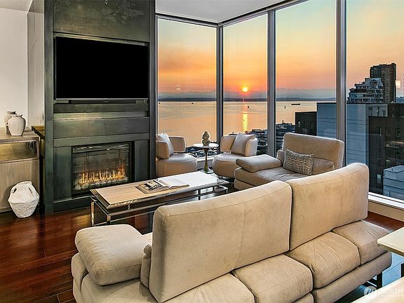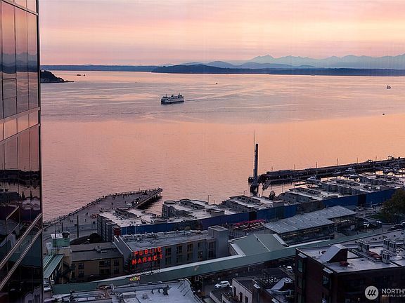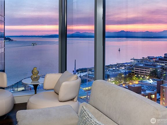 Exquisite Views! Stunning 18th floor corner home located at the coveted 1521- Gorgeous views of Elliott Bay, Puget Sound & Olympic Mountains. Expansive walls of glass, soaring 10' ceilings- home is flooded with natural light. Enjoy a unique blend of indoor-outdoor living in the enclosed glass solarium featuring retractable windows. Open-concept layout, gourmet kitchen, solid wood cabinets, top-tier appliance- dream home for entertaining. Enjoy oversized Primary with large walk in closet, spa-inspired bath,heated floors,jetted tub, oversized shower & dual vanities World class location & amenities- 24/7 concierge, rooftop BBQ, gym, yoga studio, conference room & entertaining spaces. Pike Place Market just across the street. 2pk- w/EV charger.