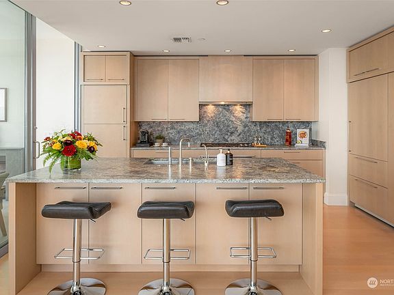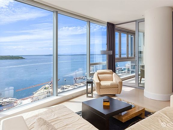 Embrace the lifestyle of living above Pike Place Market with panoramic westerly views. Endless surprises while taking in the sunset over the Olympic Mountains & Puget Sound or watching the city come alive at sunrise. Walk out your door and you're in the heart of it all. Entertaining with the highest caliber of finishes with the chef's kitchen including Subzero, Wolf and Miele. Primary suite has open spa bathroom with Toto details and radiant heated floors. Office niche, 2 parking spaces with EV and large storage unit. Just steps from Pike Place Market, Benaroya, stadiums, the arts, retail and Sculpture Park. Concierge 24/7, Walkscore 99 & two blocks to light rail. Rooftop terraces, gardens, BBQ, gym, yoga studio, boardroom, sky lounge.