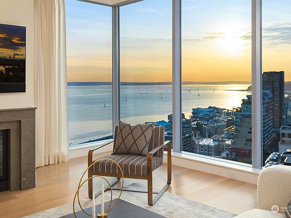 Offering views high above Puget Sound, Elliott Bay, the Olympic Mountain range and overlooking Pike Place Market plus the bonus of sparkling City lights in this sophisticated condominium residence. Exceptional interior finishes with a gracious open floor design, Crestron system w/surround sound, spacious kitchen, large pantry with abundant storage, den/media room and a separate wine cellar. Fifteen Twenty-One Second Avenue is known for its architectural walls of glass. Surround sound, two large parking stalls with EV charging and generous storage. 24/hour Five-Star concierge, boardroom, yoga studio, sky lounge, gardens, BBQ. Steps from Pike Place Market, the arts, retail, stadiums and light rail.