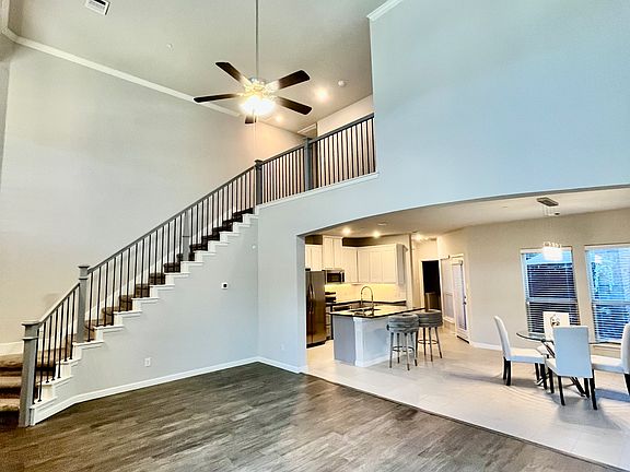 - The living room features high ceilings, an open-flooring layout, natural lighting, and wooden flooring.