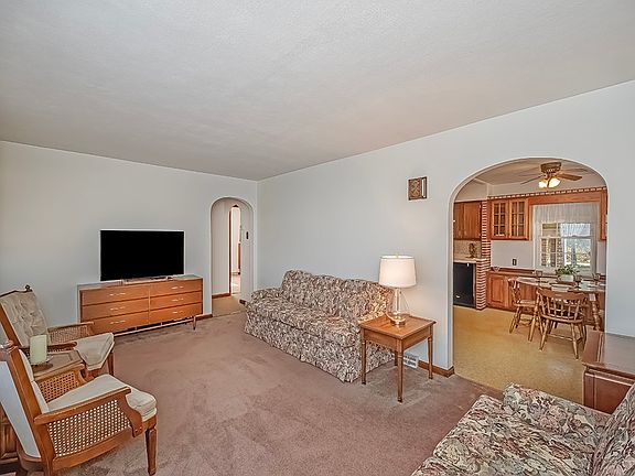 Welcome to this beautifully maintained 4-bedroom, 2-bath ranch that blends comfort, charm, and thoughtful design. The interior has been refreshed with wallpaper removed and walls freshly painted throughout the living room, kitchen, bedrooms, and baths. Gleaming hardwood floors, preserved beneath the carpet, are ready to be uncovered and admired. The galley kitchen features solid wood cabinets and opens into a dining area with seating for six, a charming built-in, and picturesque backyard views. The inviting living room is ideal for relaxing or gathering with friends, while the retro-style lower-level with built-in shuffleboard add a fun, nostalgic twist. All bedrooms are generously sized, and storage is abundant throughout. Two laundry rooms, one on each level, plus a single-car garage make everyday living effortless. Outside, enjoy a lovely covered front porch and a matching expansive patio overlooking a level, park-like lot framed by peaceful woods. Perfect for you to call home!