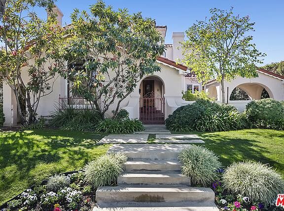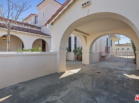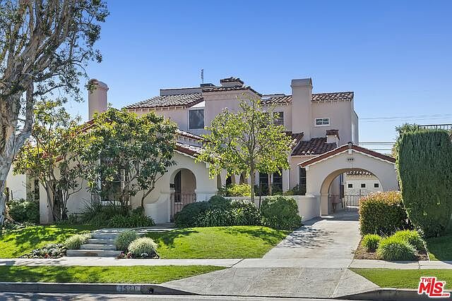Courtyard Spanish 2-story 4 bed/5.5 bath + family room including elevator with stunning original period details throughout. Charming covered arched walkway into open courtyard & entry with skylight. Grand scale living room with picture window, fireplace, original wood beamed ceiling & sconces. Dining room with soffit ceiling & skylight opens to large kitchen with sunny breakfast room overlooking front charming courtyard, laundry room with backyard access. Incredible family room with French doors opening to back covered patio & private backyard. 1 bedrm/2 bath downstairs & upstairs includes 3 bedrooms all with ensuite bathrooms. Primary suite w/ vaulted ceilings, balcony with tree top views, walk-in closet. Primary bath w/ granite & tiled finishes, separate bath & shower. Porte cochere, gated driveway & detached converted garage/playroom/office with 1/2 bath. Close proximity to UCLA, Century City & Westwood Blvd retail and restaurants. Fairburn Elementary School.