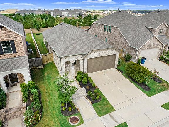 A wonderfully charming Highland 1-story home nestled in the master planned community of Bridgeland. Step into a home built in 2019 with a fabulous open floor plan that has been beautifully maintained. Gorgeous wood tile flooring flows throughout the home creating a seamless look! Tons of natural light flows into the family room, dining space and island kitchen! Kitchen boasts crisp white cabinets, granite countertops, custom backsplash and stainless appliances including a gas range! A long buffet style cabinet/counter area is ideal for entertaining! A spacious primary suite with en-suite bath features dual sinks, granite countertops, separate glass enclosed shower and garden tub! Two secondary bedrooms with pretty full bath too! A covered patio overlooks a spacious backyard with brick wall and NO REAR NEIGHBORS! Trees adorn the other side making it a peaceful place to sit and relax! Great CFISD Schools. Quick access to Grand Parkway, shopping and dining!