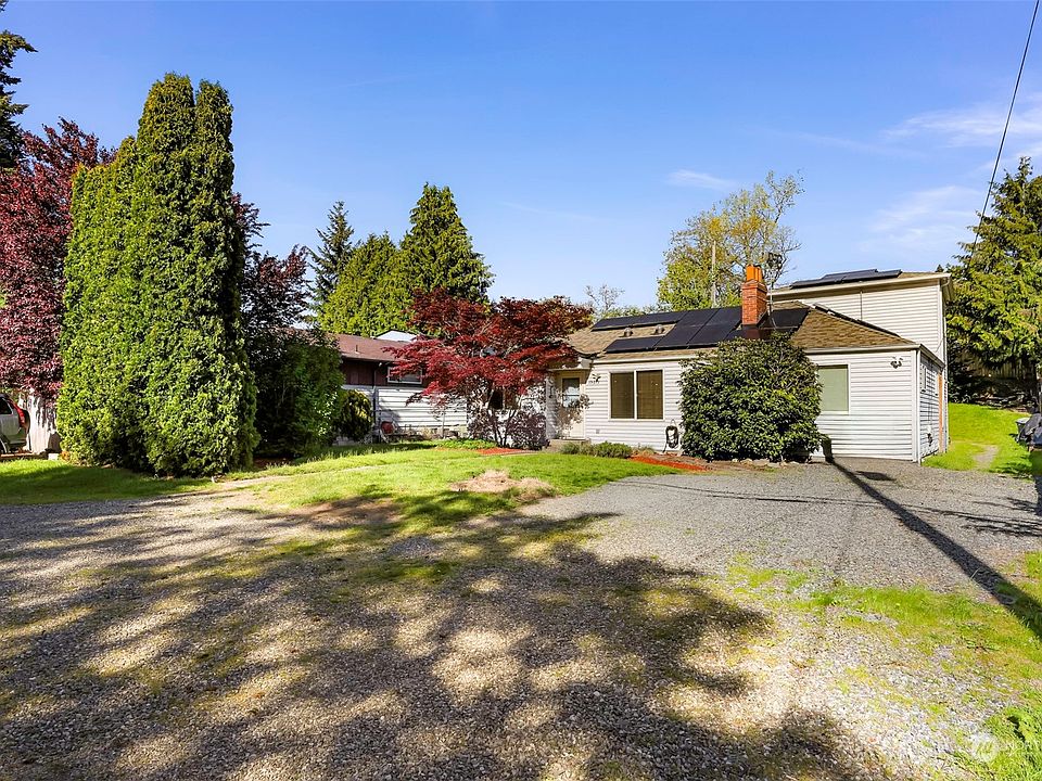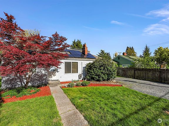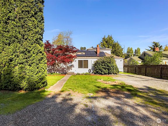 Discover this centrally located, charming 3 bed, 1.75 bath home in Shoreline. Cozy up by the pellet stove in the inviting living room. The renovated kitchen features formica countertops & an eat-in island, perfect for casual meals. Enjoy formal dining, relax in the large family room, which also provides access to the backyard. Sizable primary bedroom features an attached bath & closet. The upstairs bedroom provides a light & bright sanctuary. Unwind in the spacious backyard on the patio with a hot tub, or gather around the fire pit. The property is lush with fruit trees & has ample gardening space. Fully-owned SOLAR PANELS. Only 1 block away from Paramount Park & walking distance from the new Light Rail line & I-5. MUR 45 Zoning!