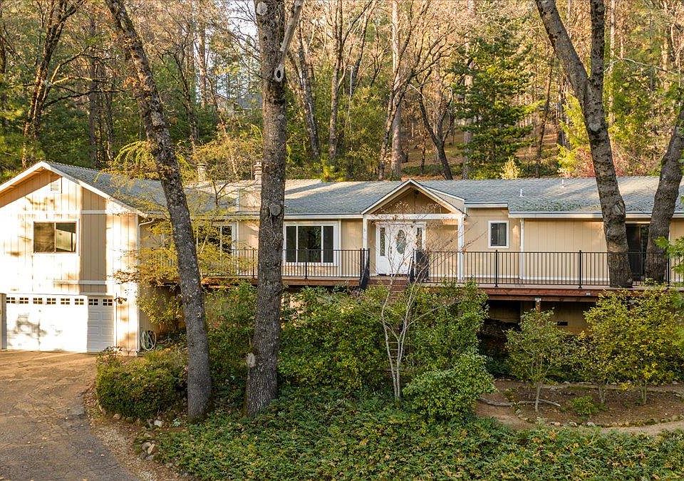 Nestled in a tranquil Alta Sierra setting, this home offers picturesque views from its expansive front deck and through windows that fill the interior with natural light. This spacious 2,564 sq ft residence features 3 bedrooms, 2 bathrooms, an office, and a versatile bonus room with its own exterior entry - ideal for guests, hobbies, or a home gym. The spacious living room is light and welcoming, featuring a fireplace and built-ins, and it opens seamlessly into the kitchen, dining area, and family room. The kitchen includes solid countertops, a farmhouse sink, and abundant cabinetry. This central gathering space offers a skylight, a wood-burning fireplace, built-ins, expansive windows overlooking the backyard, hardwood floors, and easy access to the peaceful patio. The primary suite is located at the end of the hall and features a spacious walk-in closet, along with a slider leading out to the front deck. The two additional bedrooms share the second bathroom. Enjoy the convenience of a laundry room with a sink, extra storage, and direct access to the garage. The fenced back yard, garden/tool shed, and acre lot offer both privacy and room to roam. It is conveniently located just 2 minutes from Hwy 49, 10 minutes to downtown Grass Valley, and under 30 minutes to Auburn.