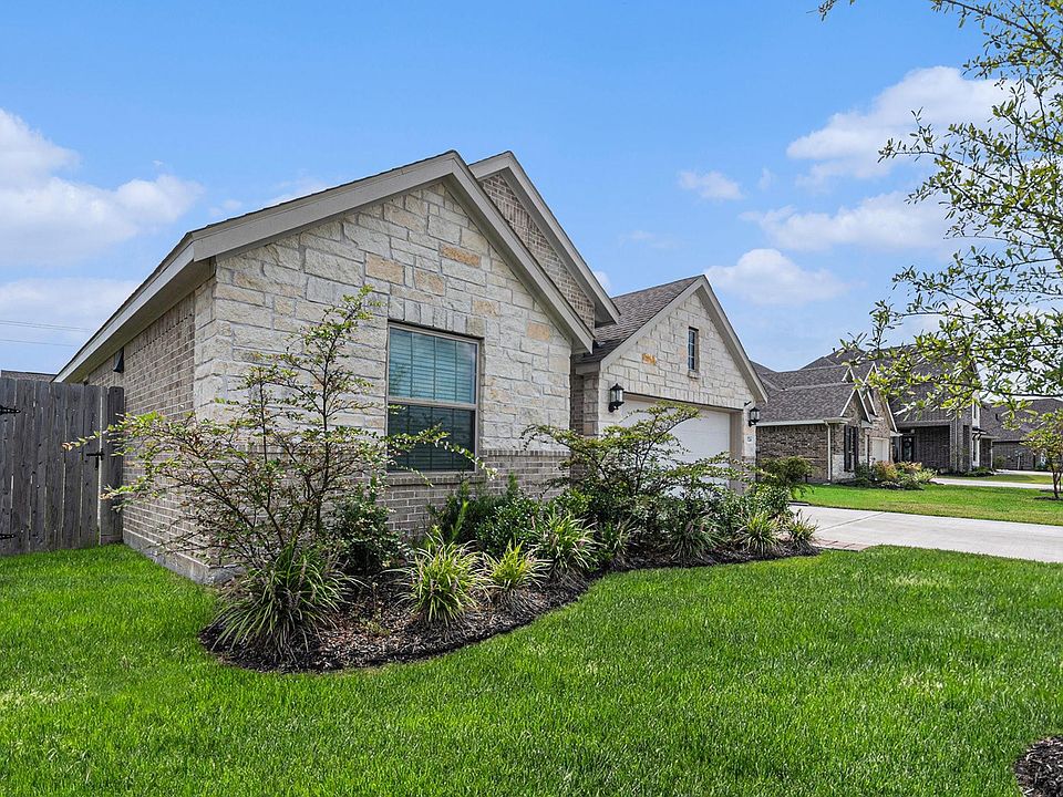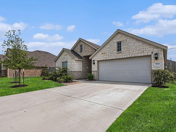 Bring all offer to this home in the sought after Barbers Hill School District. Shows New. This home offers a spacious and bright living room that seamlessly connects to the dining area. The kitchen features modern finishes, an island with bar seating, and an open flow ideal for gatherings. The primary suite includes dual vanities, a distinctive corner soaking tub, a walk-in shower, and a large walk-in closet, creating a relaxing retreat. Enjoy no back neighbors with a view of the lake from your front porch. Step outside to a fully fenced backyard, with a covered patio, perfect for outdoor dining or entertaining. Located near Eagle Pointe Recreation Complex, shopping, and dining options, with easy access to I-10, this home blends comfort with convenience in a desirable school district and community.
