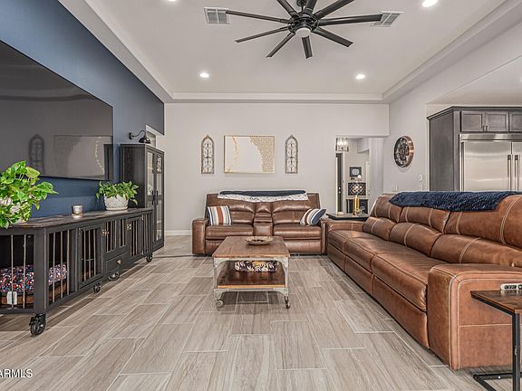 Stunning Upgraded Estrella Mountain Ranch Pool home checks every box! Open floor plan, soaring ceilings, OWNED Solar & Decorator Finishes.Hunter Douglas window treatments, plantation shutters, designer lighting compliments every space! Enjoy the Culinary Dream kitchen w/ custom tile backsplash, Walk in pantry, granite counters & island, stainless appliances, Show-stopper 6 ft built-in fridge! Relax in spacious Primary suite with luxurious spa-style bath, double vanities, glass surround shower, soaking tub & built-in closet organizers. Entertainers' backyard boasts heated pool w/water feature, built-in bbq, putting green & dog run! Addtl 4 bedrooms have access to secondary living space! Community features lakes, world-class fitness centers, pools, water park, golf, hiking trails & More! Upgrade List for 15217 S. 182nd Drive