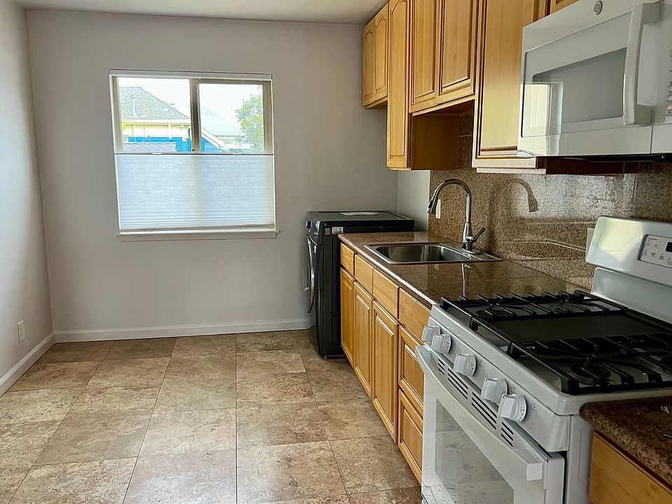 Newer appliances with built-in microwave and 5-burner stove. In-unit washer/dryer combo unit, up-down blinds.
