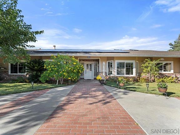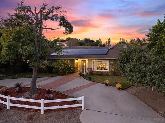 Beautiful single-story home in the heart of Fallbrook! This charming 3-bedroom, 2.5-bath home offers 2,308 SqFt of living space on a generous half-acre lot. Enjoy the spacious open-concept layout, featuring both a family room and formal living room, each with cozy fireplaces and French doors that open to a large rear patio—perfect for entertaining. The kitchen boasts stainless steel appliances and a breakfast bar. The primary ensuite offers a dual sink vanity, soaking tub, walk-in closet, and French doors that also lead to the backyard. Outside, you'll find a spacious covered patio, fruit trees, and flat, usable land, ideal for a pool, spa, or even an ADU. Additional features include a 3-car garage, RV barn/carport, solar system, and more. This home is truly a must-see!