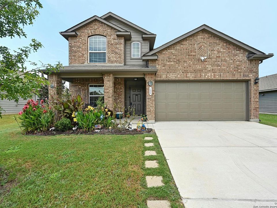 Welcome to this captivating 5-bedroom, 3.5-bathroom home with 2,319 sq. ft. of thoughtfully designed living space. From the moment you arrive, the classic brick front exterior and lush landscaping set the stage for what lies within. The large primary bedroom on the main floor is a true sanctuary, featuring a spacious walk-in shower. Upstairs, four additional bedrooms provide ample space, making this home perfect for families or those who love to host guests. An office/flex room greets you upon entry, offering a versatile space to work or relax. The kitchen, adorned with rich espresso cabinets, opens to the dining and living areas, creating an inviting space for gatherings and everyday living. What truly sets this home apart is its exquisite landscaping. With an abundance of blooming flowers and a total of 15 trees, including crepe myrtles, oaks, and a stunning magnolia, the property is a serene escape that feels like your private park. A massive, open patio invites you to enjoy outdoor living, while the backyard shed offers convenient storage. The home also features full gutters and a well-equipped garage complete with shelving, a ceiling fan, and a garage door opener. Adding to its appeal, the home backs up to the neighborhood park, ensuring privacy with no neighbors behind you. Centrally located, you'll enjoy easy access to shopping and dining, with New Braunfels just 15 miles away, San Marcos 20 miles away, and San Antonio within a 30-mile drive. This home combines tranquility with convenience-don't miss your chance to make it yours!