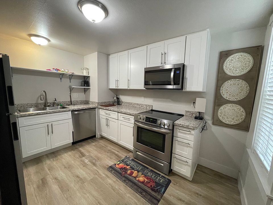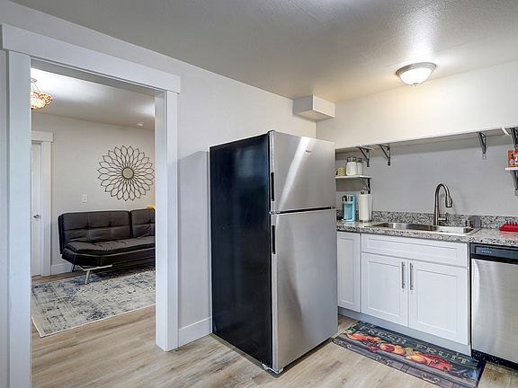 2 Queen beds + den with huge full bath. Small desk & chair. Futon in the living room, flat tv, dishwasher, full stove, microwave. Fully remodeled interior in 2018 with a little old world charm detail intact. Laminate floors, stainless steel appliances, ground level access. This is the entire lower floor of the building. Toasty gas fireplace, tall ceilings, and quiet. Full size private laundry in unit. Tankless gas water heater. Kitchen ready for use, tea kettle, air fryer, coffee, etc.