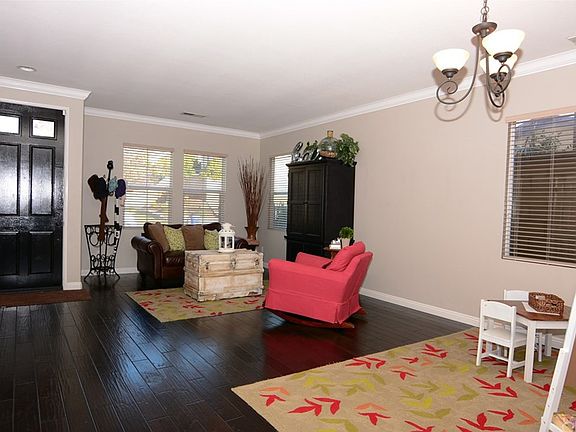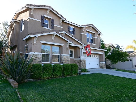 This gorgeous 4 bedroom 2 1/2 bath home nestled in the heart of the Colonies is a MUST SEE! From the moment you open the front door the warmth of this home draws you in and makes you feel completely at home. The formal living and dining rooms are spacious with beautiful dark wood flooring. The family room is also large and has the same wood flooring as the living room and it opens up to the kitchen. The kitchen has tile flooring, recessed lighting, a stainless steel double oven, microwave, stove top and a dishwasher. There is an island with a wine refrigerator, storage and an eating bar. There is also a half bath and an eating area adjacent to the kitchen with a ceiling fan and space for a table and chairs. Upstairs you will find 3 spacious bedrooms plus a huge master bedroom with the same beautiful wood flooring, walk-in closet and a stunning custom wood sliding doors leading to the master bathroom which has a large oval soaking tub, shower and dual sinks. There is a bathroom off of the hallway and an upstairs laundry room. The rear yard is perfect for entertaining and has a wonderful outdoor living area complete with covered patio with ceiling fan and a wonderful grassy area. There is a walking path behind the home which makes for a serene setting. There is a beautiful view of the mountains from the front yard. The Colonies are conveniently close to shopping, restaurants and the 210 Fwy.