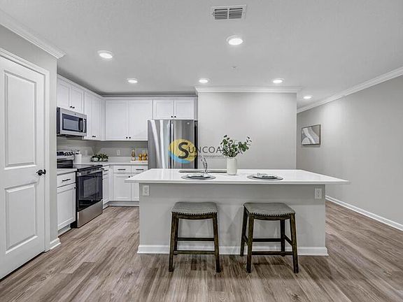 Center islandStylish vinyl wood flooringSharp countertopsBrand-new stainless-steel appliances