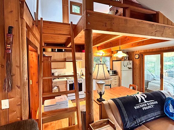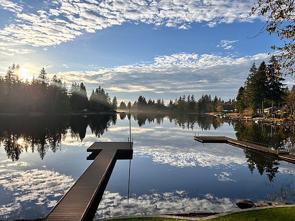 House sits directly on the lake with private dock. Includes electric adjustable king size bed in downstairs sunroom. Queen size bed upstairs in the loft. Twin size bed and queen sofa pull out in the living room. Also has a steam sauna built-in into the bathroom. Newer remodel on kitchen and bathroom. Has ample parking and a Kids playset. Extremely quiet neighborhood beautiful sunsets, lots of ducks, deer, eagles, and good fishing. Includes kayak and small rowboat.