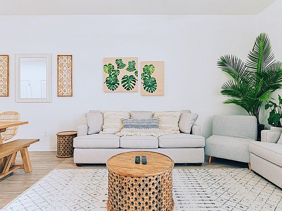 Beautifully furnished coastal townhomeBohemian accentsPull-out queen bedsDouble-over-double bunk bedGame roomOpen conceptJungle-glam bedroom
