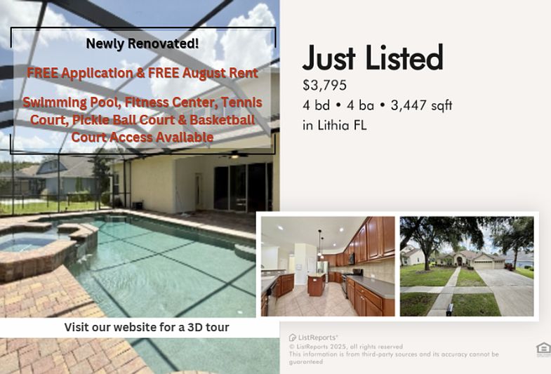 FREE APPLICATION & FREE AUGUST RENT ** New listing with 10 Stars Property Management ** Beautiful 4 beds 4 baths is available for rent in Lithia, FL. Welcome to 15224 Kestrelrise Drive, nestled in the heart of the highly sought-after FishHawk Ranch community, one of Lithia's premier neighborhoods! This beautiful home offers access to top-rated schools, lush walking and biking trails, resort-style pools, fitness centers, playgrounds, and community events that make it perfect for families and active lifestyles. Adventure is never far, with Lithia Springs Park and the Alafia River nearby for kayaking, swimming, and weekend picnics under the oaks. Just a short drive away, you'll find charming local dining and shopping in downtown Brandon, and quick access to Tampa opens the door to endless entertainment, nightlife, and professional sports. Whether you're raising a family or simply seeking a peaceful retreat with every modern convenience, this location delivers the perfect blend of nature, community, and connection. 3D Tour Available: Features: - Application fee will be credited back on the 1st month of rent if approved - Located in a gated community for added security - Three car garage ideal for multiple vehicles, extra storage, or your weekend toys - Mix of vinyl, tile and hardwood flooring for durability and easy maintenance - Gourmet Kitchen is equipped with sleek stainless steel appliances, wood cabinetry for timeless charm, and a spacious pantry to keep everything organized - Dishwasher for hassle free cleanup after meals - Spacious kitchen/living area for gathering and entertaining - Formal dining room great for entertaining or family meals - Ceiling fans for added comfort and airflow - Window coverings for privacy and light control - Laundry room equipped with washer and dryer for laundry convenience - Walk-In closets with plenty of room for clothes, shoes, and storage - Double sink vanity for added convenience during busy mornings - Bathtubs and walk-in shower for versatile bathing options - Screened-In Private Pool in your own backyard oasis, perfect for lounging, entertaining, or a refreshing dip in the Florida sunshine. - Access to fitness center, tennis court, pickle ball court and basketball court - Screened enclosed lanai perfect for relaxing without the bugs - Part of an HOA Community with a $50 HOA application fee - Tenant is responsible for paying all utilities including pool and lawn care Pets are allowed. No more than 2 pets per property. Weight limit of 55lbs per pet. No aggressive breeds. Applicants must complete a free pet application and have animal approved with vaccination record. The monthly pet fee will be determined by your pet screening score. Does not apply to medically/emotional support prescribed and/or service animals. At 10 Stars, we offer multiple services to make your stay with us easy and comfortable. We have a same-day application approval and a quick move-in for no additional cost. Our team is professionally trained and will be able to assist with any leasing, billing, or maintenance issues our tenants have. We also offer an emergency line available 24/7 for any urgent cases. Tenants have access to an online portal where they can make rent payments, communicate with our team and get updates on their payments and maintenance requests at all times. THE FIRST MONTH AND SECURITY DEPOSIT ARE REQUIRED Renter's insurance is required prior to moving in. Rules and Regulations are on our website! Only $65 non-refundable application fee per adult with 10 stars property management