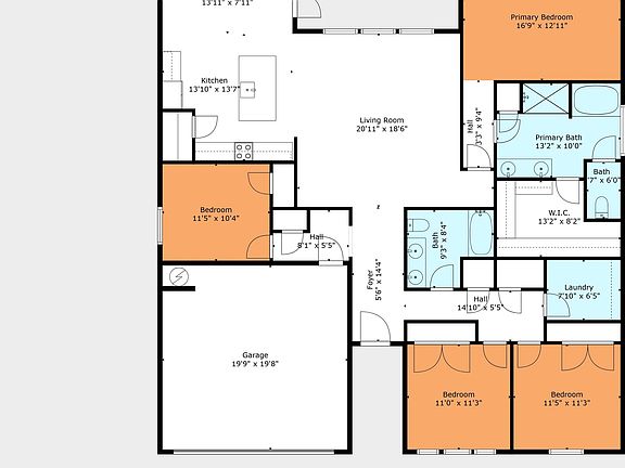 A unique layout includes one bedroom located near the garage and laundry area—perfect for a guest room or office—while two additional bedrooms, a full bathroom, and the laundry room are located on the opposite side of the hall, offering privacy for everyone.