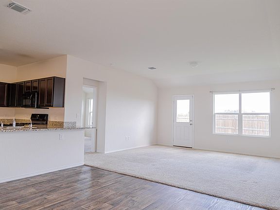 Beautifully maintained single-story 2019 home in Austins Colony. This open-concept home features recently updated luxury plank floors in the living areas and a large kitchen with tons of counter space. Upgrades (not pictured) include solar panels (creating extremely low electricity bill), washer & dryer, a built-in water filter in the kitchen sink, window treatments, a water softener, and prewire for ADT security system with cameras. The large, fully fenced-in backyard backs to a serene pasture/green space. Just minutes away from Tesla and the airport as well as quick access to toll 130 and 45, highways 290 and 183.