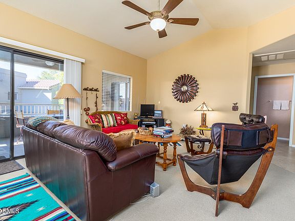 Only unit in Villages North with a garage! This 2nd story end unit located in the interior of the complex on a quiet cul-de-sac is turn-key and ready as for winter visitors, as a rental or perfect home for someone. Well maintained 2 bed, 1.5 bath featuring an open great room floorplan, vaulted ceilings, ceiling fans, eat-in kitchen, inside laundry and pvt balcony overlooking the lush landscaping. Master bed features wall to wall mirrored closets, dual sinks, tub/shower, and sep exit to pvt balcony. 1 car garage for private and secure parking. Complex features pool, spa, BBQ areas. Located on the 101 curve near Kierland Commons, Westworld, Scottsdale 101, and easy access to all parts of the valley. Furnishings available under separate bill of sale-easy turnkey!