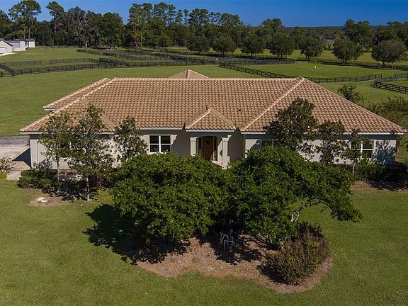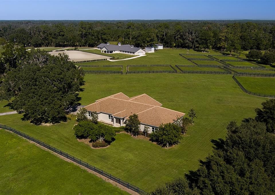 Situated 15 minutes from the World Equestrian Center and 5 minutes from HITS, this 42+ acre farm benefits from a prime location within Ocala’s leading equestrian community. The property is fully fenced and gated, with mature oak trees that create a beautiful and private setting from the moment you arrive. The farm’s equestrian amenities are extensive and thoughtfully designed. A well-appointed, center-aisle 20-stall barn features comfort mats, wash racks, a dedicated tack room, half bathroom, and a spacious laundry room. A private apartment/office within the barn includes its own kitchen, bedroom, full bath, and half bath, providing excellent flexibility for on-site staff or guests. Multiple lush paddocks offer ample turnout, and the 150x250 arena complete with all weather fiber footing delivers a quality riding surface suited for training and daily exercise. A separate 2-bay shop adds valuable storage and equipment space. The main residence is warm, inviting, and finished with thoughtful details. It includes 3 bedrooms, 2 full bathrooms, and 1 half bathroom. Tray ceilings and natural light enhance the comfortable interior. The updated kitchen features modern appliances, generous countertop space, and a practical layout fitting for both everyday meals and entertaining. French doors lead to a charming back porch outfitted with an outdoor kitchen, a fire pit, and a relaxing seating area overlooking the property. A separate guest house offers additional accommodations with 3 bedrooms, 1 bathroom, a full kitchen, living area, and laundry room, ideal for guests, family, or farm staff. With its prime location, appealing setting, and well-rounded amenities, this property provides a functional and welcoming environment!