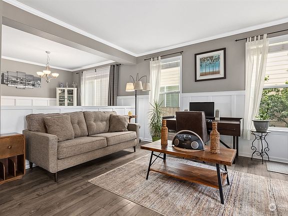This welcoming home in the heart of Yelm features a bright, open layout with a formal living and dining area. The spacious island kitchen with granite countertops and stainless-steel appliances opens to a cozy family room with a gas fireplace. Special details include 9-foot ceilings, crown molding, and durable laminate flooring. Upstairs, you'll find the primary suite with a vaulted ceiling, a walk-in closet, and a 5-piece bath! Large bonus room, 3 guest bedrooms, a full guest bath and functional upstairs laundry! The level, fenced yard features an extended patio & garden space. 3-car tandem garage & plenty of storage space. Conveniently located near JBLM, golf courses, the Chehalis-Western Trail, schools & parks.
