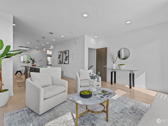 Spacious townhome boasts nearly 9’ tall ceilings on all levels & window-wrapped corners for ample daylight. Luxurious wide-plank floors & lighting fixtures. Welcoming open concept plan w/ generous kitchen & dining, defined entryway & living rm. Separate quarters perfect for guests: wet bar in den, full bathrm & bedrm. True primary bedrm with massive walk-in closet, 5-piece bathrm w/ wet area, balcony. 3rd bedrm & 3rd full bathrm for max functionality. Expansive roof deck w/ territorial views. Ductless mini-split installed 2021. Brand new washer & dryer installed July 2024. Dedicated parking behind home for convenience. Located on street-end, no passing traffic. Judkins Park light rail station 2-min walk away, easy access to I-90/I-5/buses.