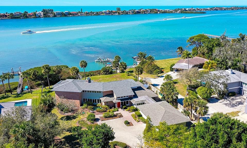 One or more photo(s) has been virtually staged. This custom-built, one-owner, four-bedroom, 4,600 square foot home is located above the base flood elevation on a wide one-acre parcel, offering privacy, space, and over 130 linear feet of private water frontage on a wide stretch of the intracoastal waterway. A huge bonus: it is not in a flood zone and sits at 13 ft elevation. There was zero flood/surge damage from Helene or Milton. The home has wonderful curb appeal and is set back from the street with a circular driveway and a brick pathway flanked by a well-stocked koi pond. You enter the two-story foyer which opens up onto a large, light filled living room with soaring 19 ft ceilings, rich wood floors, a wood-burning fireplace with floor to ceiling coral stone surround, and sliders out to the sun-soaked pool deck. There is a formal dining room, a separate family room with wet bar and ice maker, a large kitchen with an adjacent breakfast room, a butler's pantry and an antechamber that is set up to be a wine storage room. The kitchen has a double oven, huge Subzero freezer, separate refrigerator and plenty of countertop space, and a handy passthrough to the family room. There are two bedrooms on the first floor and a bathroom which serves as a pool bath if you don’t want to rinse off in the outdoor shower. In addition to the four bedrooms and office in the main house, there are two additional air-conditioned work/hobby spaces in the garage, which is accessed via a covered walkway. One of the rooms faces north and was used as an art room. The other is sound-proofed and could work well as an office, dark room or gym. The oversized garage has a workbench. The second floor has two sections connected via a walkway overlooking the main living area. To the right is a nice sized bedroom and ensuite bathroom and to the left is the primary suite with a beautiful wood-paneled office with rich wooded cabinetry and a wood burning fireplace. A screened balcony off the bedroom and office offers unparalleled views of the intracoastal waterway and some of the Gulf coast’s finest sunset skies. These wide-open west-facing views are part of what makes this home an incredible opportunity for its new owner. There is a covered screened lanai as well as uncovered outdoor living and dining space. The pool is huge and has a max depth of 8 ft. Enjoy a navigable route out to the main channel. Take this incredible .97-acre waterfront property, make it your own, and enjoy endless sunsets and all that the Florida lifestyle has to offer!