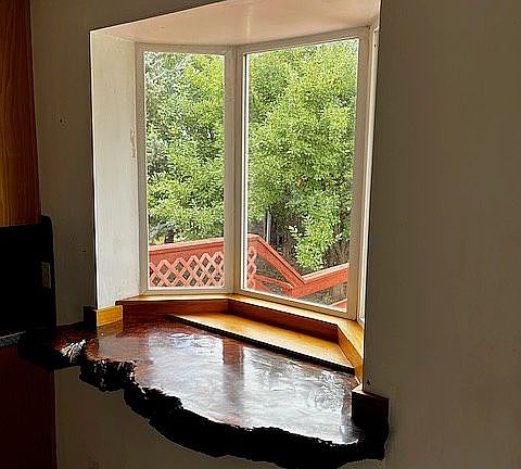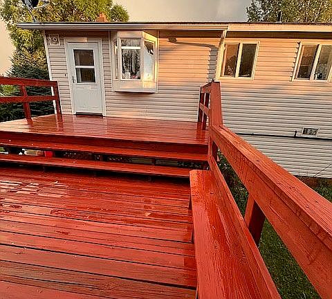 An open floor plan on the main floor featuring a large kitchen and dining room with custom woodwork and a bay window, spacious living room, master bedroom with walk in closet and half bath, second bedroom, and full bath and a walk out two-level deck.