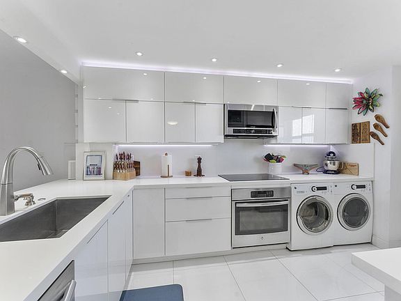 Waterfront condoContemporary fixturesBright open floor planBuilt-in oven and cooktopPlenty of natural lightGleaming white tile flooringSerene water views
