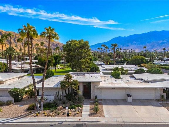 Discover the luxury of living in great architecture! Designed by Charles E Du Bois and built by Roy Fey in 1976, this beautiful home gives you the desert lifestyle you're dreaming of. Grand double doors and formal entryway lead to a spacious great room with tall ceilings and a sunken bar - perfect for entertaining! A wall of glass and clerestory windows bring in the sunshine and mountain views! The home has a fully-owned 28 panel solar system and new terrazzo tile flooring, yet retains the charm of original details including the unique and beautiful combed stucco wall treatment! All rooms are generously proportioned and allow you to stretch out and live comfortably. The den, with its floor-to-ceiling fireplace, can be configured as a media room, home office or a third bedroom. The only shared wall with the neighbor is along the garage and laundry room. In every other respect, this home lives and feels like a standalone home, with windows on all four sides to maximize light and air. Primary bedroom, living room, and eat-in kitchen all have sliders for direct access to the rear patio and the expansive greenbelt. Canyon Vista Estates is a community of just 26 homes, 2 pools, and tennis court, just minutes to shops and restaurants.Come see this spectacular home today!