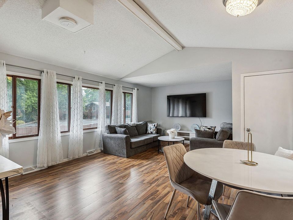 Discover this renovated 3-bedroom, 2-bathroom townhome with a spacious layout. Freshly painted and featuring new stainless-steel appliances, this home is move-in ready. The upper level offers a private bedroom with a full bath, while the main level includes two bedrooms, a full bath providing ample space for family or guests. The bright and airy kitchen flows seamlessly into a separate dining room, making it ideal for gatherings. The generous living room opens to an outdoor deck, perfect for relaxing or hosting summer barbecues. Unfinished lower level is a blank canvas of instant equity with possibilities—envision a game room, home office, or cozy sitting area, plus extra storage space. Located near Rice Creek West Regional Trail, Creek View Park, Medtronic, Hwy 65, and close to schools, shopping,