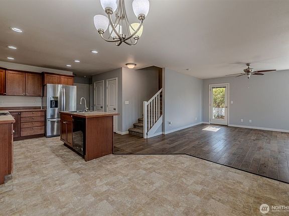 Landscaped lawnTwo-car garageCarpeting upstairsHardwood and vinyl flooringFenced outdoor escapeLots of cabinetryStainless steel appliances