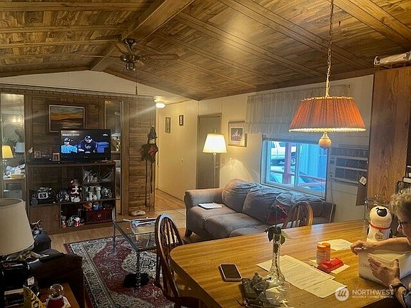 Move in ready mobile home. Two bedrooms and two full bathrooms. Vaulted ceilings in living room, kitchen and primary bedroom. Primary bedroom features a full bathroom and walk-in closet. Eating area at counter or ample space for a kitchentable. Laundry room off kitchen with shelving and storage. Fenced yard on side of the home. Great for garden and/or barbecue. Adequate parking for two cars. Close to stores and activities.