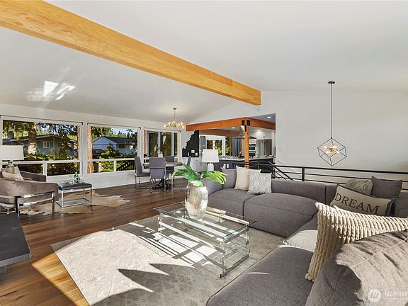 Contemporary upgrades & mid-century charm shine in this Lake Hills stunner on a quiet cul-de-sac! The bright/open layout centers around a designer kitchen featuring slab quartz counters, custom backsplash, SS appliances, abundant storage & dual islands - effortlessly connecting the dining, living & sunroom! Entertain or grab a quiet moment on the deck overlooking the huge, fully fenced backyard. Luxurious Primary Suite includes a spa-style bath w a custom multi-head shower, walk-in closet, elegant hardware/finishes. Lower level adds flexible space, bedroom, ¾ bath + utility room – perfect for a play room, gym, theater or office. Refinished hardwoods, fresh paint, updated lighting, dual gas fireplaces, A/C & 2 car garage! Bellevue Schools.