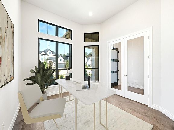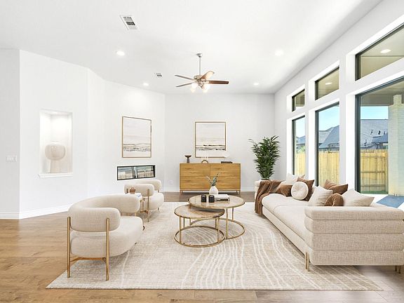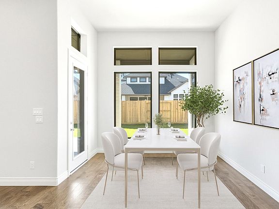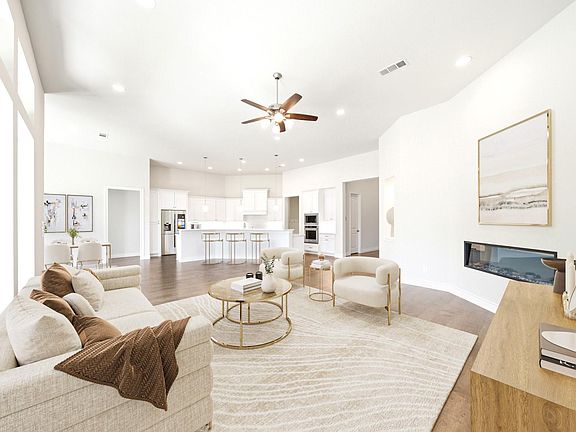 1-story home features large entry with 12' ceilings that extend past open dining room. Open kitchen overlooks the large family room, breakfast room, and features 42" cabinets, high-bar seating, and an oversized island. Family room features a corner electric fireplace and full wall of windows. Master bath includes a freestanding tub, separate shower and His and Hers vanities. Oversized 33' wide patio overlooks the backyard.