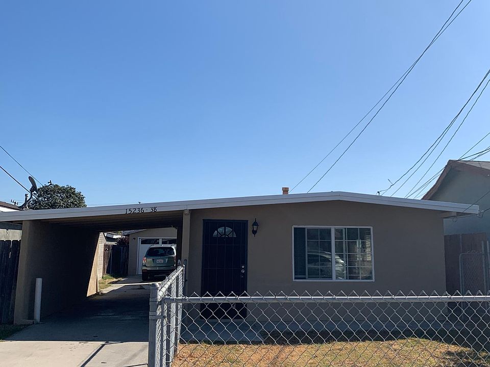 2 bedroom, 1 bath house with a 1 car garage. Front house with a small fenced yard. Two units on the lot. Laundry hookups inside unit. Owner pays for water.