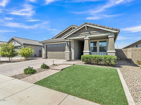 Beautiful Craftsman style home on PREMIUM LOT facing the COMMUNITY PARK! Estrella Commons is the ideal location with shops, restaurants & freeway access all close by. This home features amazing curb appeal w/ stone/siding work, front porch (w/ decorative fencing), & a custom front yard landscape package that has turf, paver steps, lighting, double gate w/ trash can pad & more. Enter through the 8' door into warm wood-look tile floors, neutral paint, & 9' ceilings. The elegant gourmet kitchen includes upgraded white cabinets w/ rollout drawers, wall oven/microwave, gas cooktop, black SS appliances, upgraded granite counters, under-mount sink, backsplash, pendant lighting & walk-in pantry. This great-room layout is perfect for any furniture arrangement & the large glass door panels allow for lots of natural light. The primary bedroom easily fits a king size bed, nightstands & dresser w/ plenty of room to spare. The attached primary bath has warm cream colored cabinets, squared-off sinks, decorative backsplash, private toilet room, large walk-in shower & a spacious closet. Plenty of extra room w/ the additional three bedrooms & two bathrooms. The backyard is a blank canvas for your imagination to run wild. Plenty of space for a swimming pool, BBQ island, sitting area or whatever makes it your own personal paradise. The community park features a basketball court, large grassy area, a large playground & a ramada w/ seating & BBQ grills. With nearly $60k in builder upgrades, this is an amazing place to call "Home".