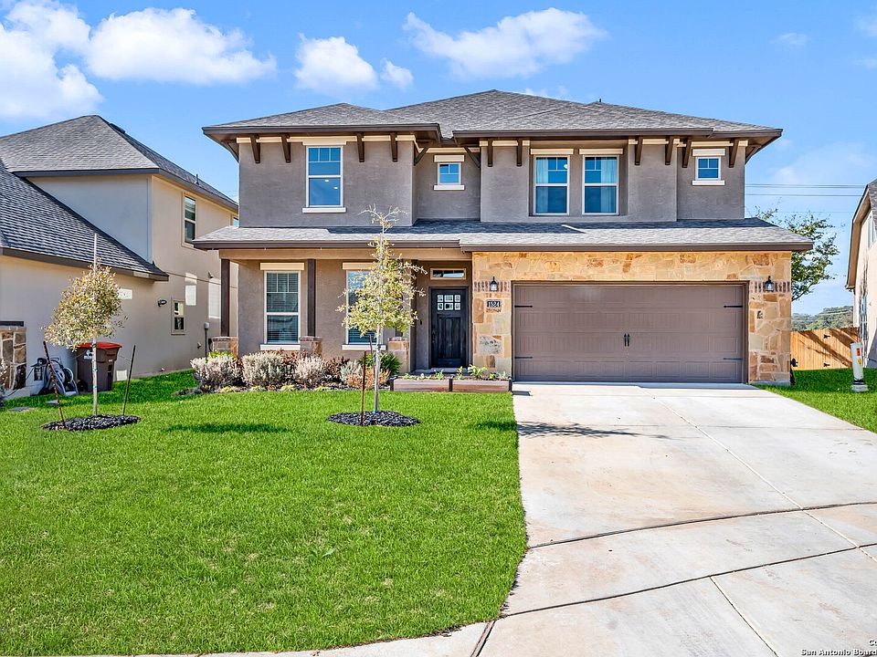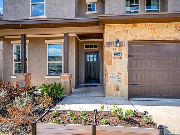 This Bulverde residence frames luminous interiors with clean architectural lines set within the top rated Smithson Valley school district, home of the 2024 State Football Champions. Clerestory windows and wrought iron balusters lend character to the interiors, complemented by recessed lighting and a balanced mix of formal and informal spaces. A private study anchors the main level, while upstairs a generous game room expands the home's versatility. The island kitchen is outfitted with gas cooking, glass-front cabinetry and pendant lighting, combining function with refined detail. The home extends outside to a covered patio, ideal for gatherings or quiet evenings.