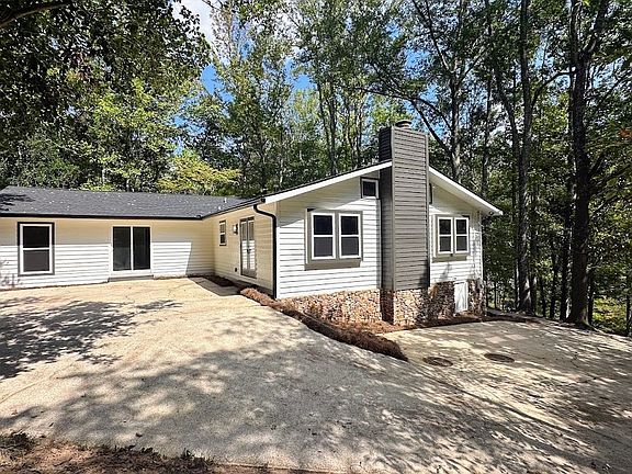 Welcome to this beautifully refreshed home, perfectly nestled on 1.48 wooded acres and designed for comfort, style, and flexibility. The inviting front porch, stone-accented exterior, and peaceful setting create a warm welcome from the moment you arrive. Inside, an airy living area boasts vaulted ceilings with exposed beams, a stunning floor-to-ceiling stone fireplace, and luxury vinyl-plank flooring throughout. Natural light pours through large windows, highlighting the home's craftsmanship and fresh finishes. The bright, open kitchen features quartz countertops, brand-new cabinets, and stainless steel appliances, making it the perfect gathering place for meals and entertaining. With 4 bedrooms and 3 full baths, the layout includes a versatile wing that could serve as a second master suite, teen suite, or private in-law quarters, giving you options for guests, multigenerational living, or a deluxe home office. Outside, you'll love the privacy and space this lot provides - room for a fire pit, or simply a quiet spot to enjoy nature. Conveniently located yet surrounded by mature trees, this home blends privacy with accessibility.