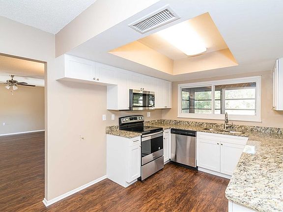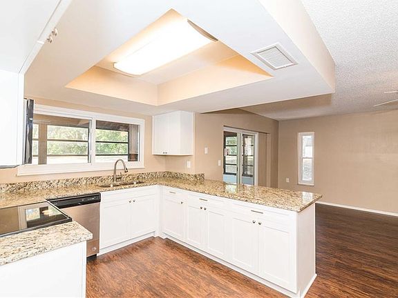 There is no doubt you've won the Lotto! Ranch home situated on a private oversized lot featuring a 2 car garage with an extended semi-circular driveway! No disappointment here with the Fresh Neutral Paint, Brand-New Luxury Plank Flooring throughout living spaces, Brand-New SS apps, Brand-New Kitchen Cabinets, Elegant Granite Counters to include a Breakfast Bar pouring into the Family Room. Yes, there's a Family Room separate from the Formal Living and Formal Dining Room. This Upgraded Kitchen also features Dinette Space and Pantry Closet. Split Bedrooms include Brand-New Carpet and Owners En-Suite features Walk-In Closet. Master Bedroom and second bedroom are adjoined by the Master En-Suite with privacy doors and is the perfect set-up for a nursery, office, study, library, reading niche, craft room, she-cave, man-cave, home gym, or whatever your heart desires because the possibilities are endless. New Bath Vanities, New Lighting, Two Linen Closets, Coat Closet, Inside Laundry Room with lots of storage, and Large Windows Boasting Florida's Natural Sunshine. Screened Lanai is the perfect setting for hosting barbeques while family and friends play games on the generously sized yard, which also conveys a storage shed. There is more than plenty of space for adding a pool without compromising your Land. Brand-New Electrical Panel. Your neighborhood is conveniently located close to shopping, restaurants, medical, Gulf Coast Beaches, with easy access to US-19.