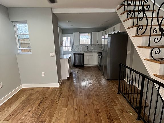 The first floor features recessed lights, vintage iron railings, an open kitchen with extra counter space, granite counters, and stainless appliances. Private fenced yard. The second floor has three bedrooms, hall linen closet, and full bath with tub/shower. The main bedroom has double closets with exposed brick details.
