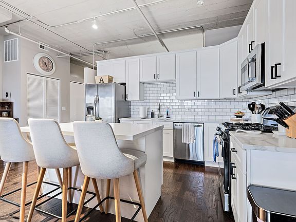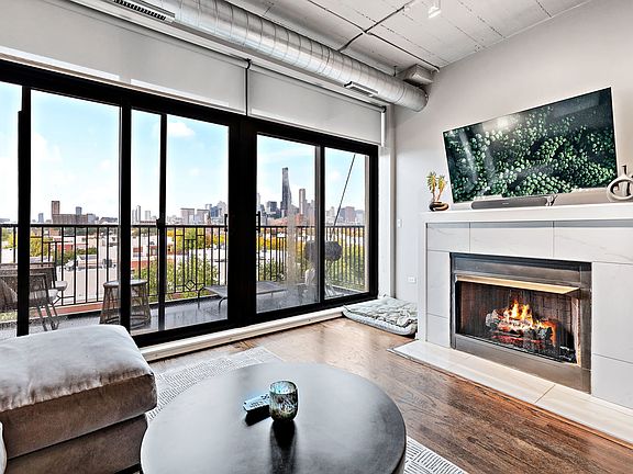 Welcome to this beautifully renovated 2-bedroom, 2-bathroom condo, featuring a modern split floor plan and breathtaking north-facing skyline views. Enjoy a spacious and private balcony-perfect for relaxing and taking in the panoramic cityscape. With a loft-inspired aesthetic, this home offers soaring 10' ceilings and an abundance of natural light throughout. Primary bedroom is fully enclosed for ultimate privacy and comfort.The condo was completely updated in 2021, with a brand new kitchen, bathrooms, and refinished wood floors. The kitchen boasts sleek new cabinets, quartz countertops, a subway tile backsplash, a farm sink, and a high-end GE stainless steel appliance package. The large open island kitchen is ideal for both cooking and entertaining. The cozy living room features a fireplace, adding warmth and charm to the space. Additional highlights include in-unit laundry, ample storage, a bike room, and heated garage parking, all included for your convenience. See additional information for full list of improvements.