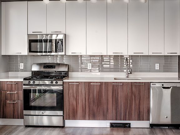 - Modern kitchen with sleek cabinetry, stainless steel appliances, and stone countertops