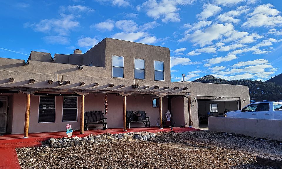 Modern, custom home in the lovely Ledoux Valley in Northern New Mexico. Spectacular mountain views from this homesite among the willows. The home offers space and comfort, with vigas, latillas, kiva fireplace, family room, den, dining. Master bedroom and bathroom on the main level. Enjoy the views and our summer breezes from the balcony or the covered portals on both sides of the home, within the adobe-walled courtyard. The property is mostly open, with room for your animals or projects, and there is a shed in the yard. A truly exquisite piece of the lovely Mora Area. Come and see this amazing property today!