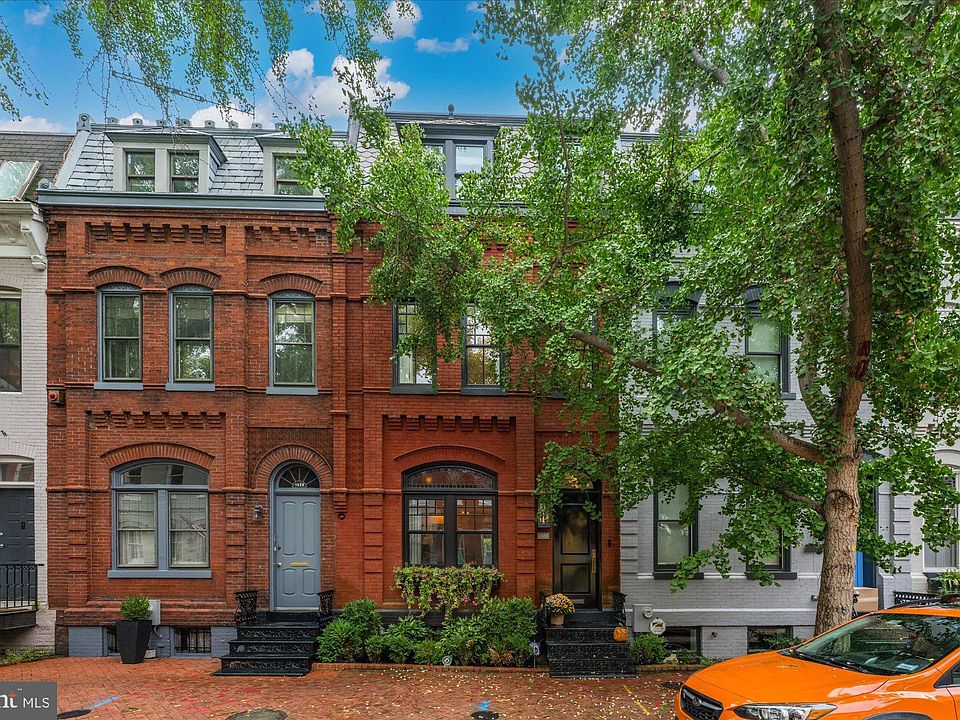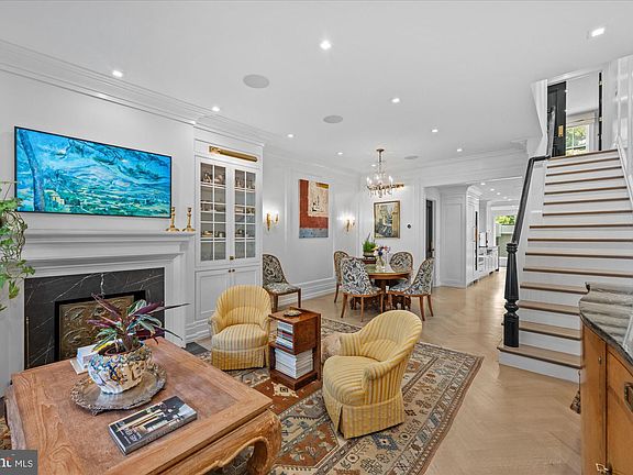 Originally built in 1885, and located on one of the cities most picturesque blocks in Logan Circle, this 5bdr/3.5 row home was completely renovated in 2020 by Akseizer Residential. This special residence blends historic charm and character with modern luxury and high-end finishes. The main level features custom herringbone floors, an open living room with a gas fireplace and custom built-ins, a spacious dining area. The custom chef's kitchen features custom marble, high end appliances including a Wolf 6-burner range and a floor-to-ceiling wine refrigerator. A wall of rear windows overlooks the private courtyard and provides easy access to secure off street parking. The second level offers a generous primary suite with a gas fireplace and custom built ins. A large rear room doubles as a guest space, office, or den and opens to a private terrace. The level is completed with a large bathroom featuring marble, a double vanity, walk in shower and waterworks brass fixtures. The third level includes two additional bedrooms and a full marble bathroom with brass fixtures. The lower level adds a media/recreation room with a built in entertainment wall, a fifth bedroom, a full marble bathroom, and a well appointed laundry room. A brick courtyard with a roll up door completes the home with privacy and convenience. Renovated with exceptional detail and quality throughout.