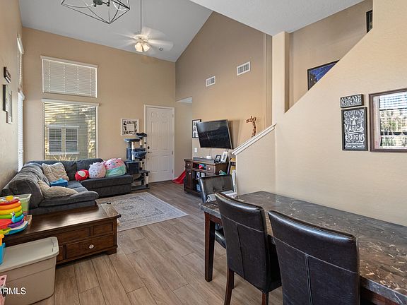 Nice gated community conveniently located to shopping, parks, Surprise community center and Luke AFB. New luxury vinyl wood flooring installed 3 years ago , newer A/C, roof just replaced Apr. 2023. Master bedroom located downstairs, with separate exit to private patio. Unit is located on corner for easy walk to playground, community pool, spa and work out center. This unit has large loft area, for play room or office, and attached 2 car garage, for easy parking. Great starter home, or could be great rental for an investor.